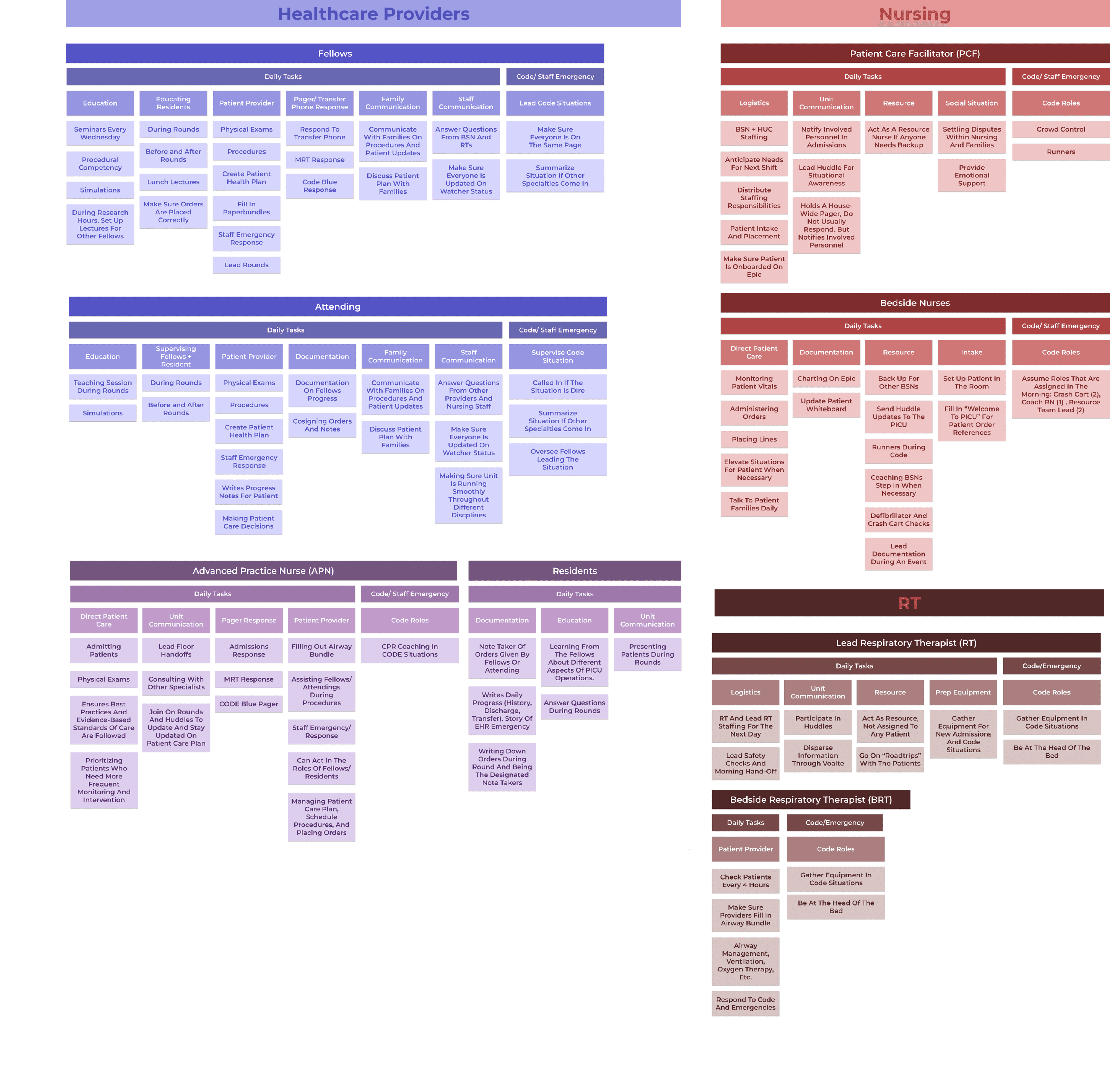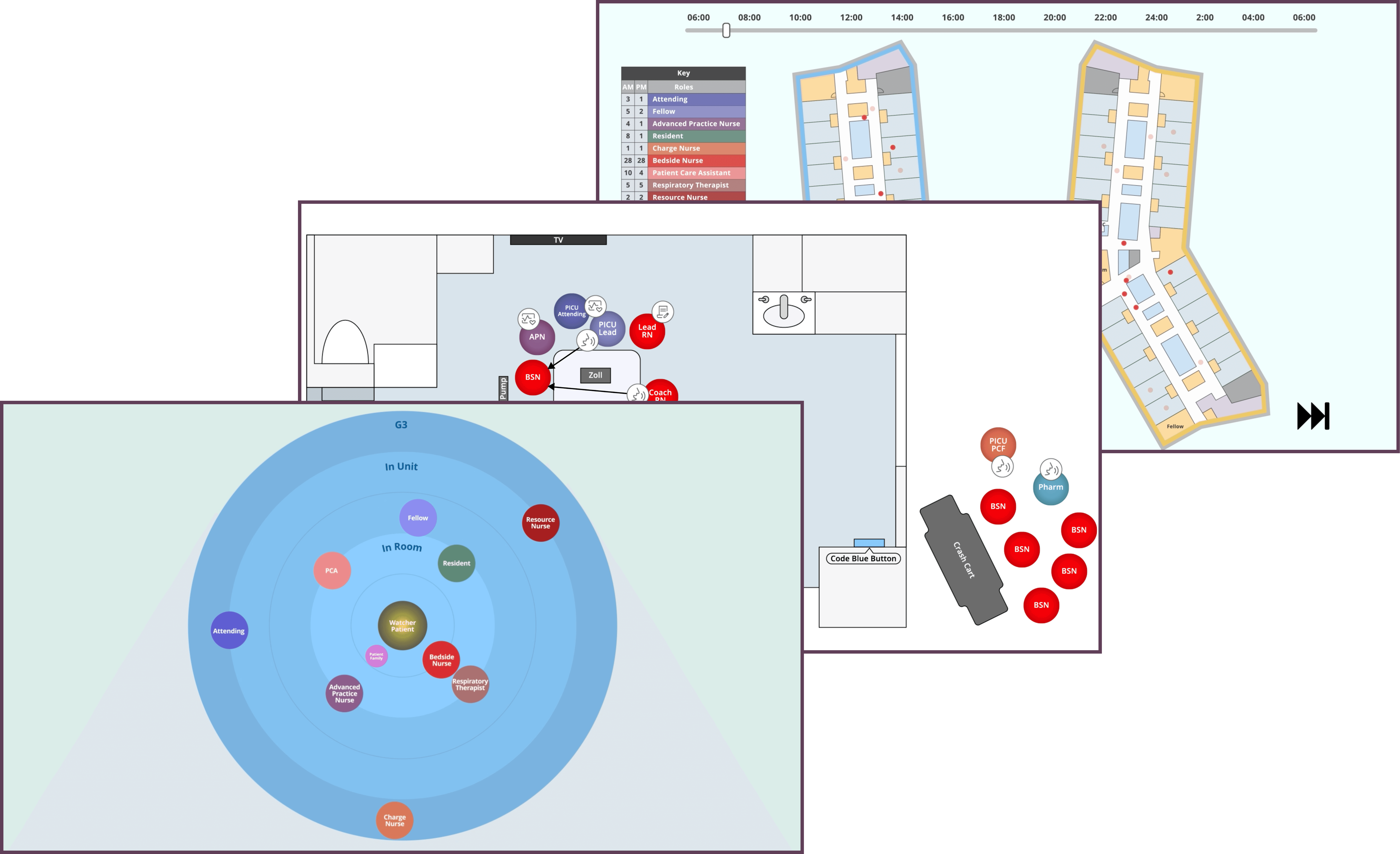 Movement of each team member within the PICU, showing how different roles function throughout the day
