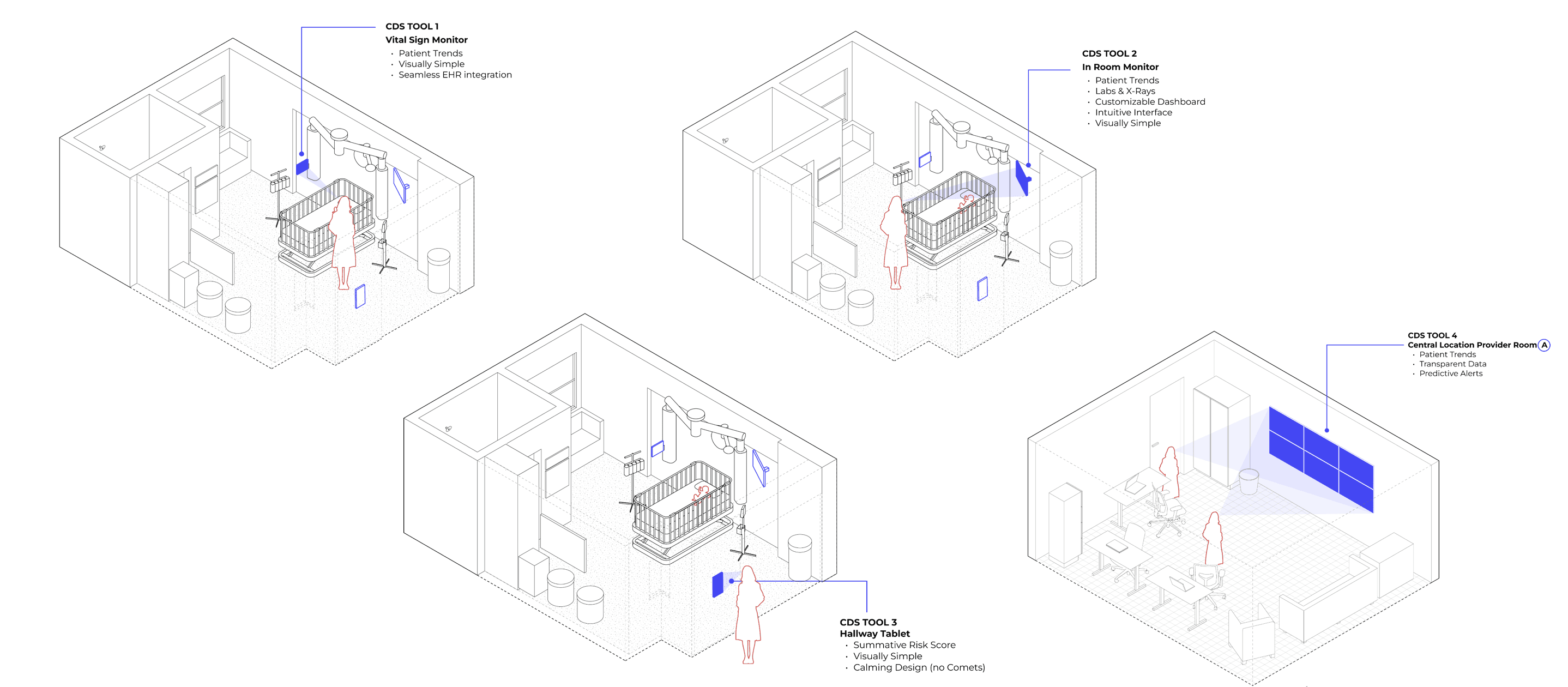 Through the process of researching, ideating, and refining, the team developed 4 final CDS tools to implement in the PICU